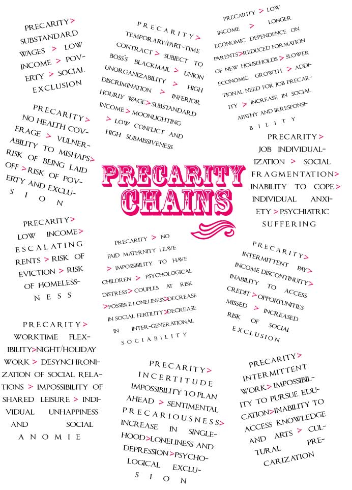 (EN) In 2004 I curated the graphic and infographics in the Precarity Issue of Greenpepper Magazine. I still remember the brainstorming we did to create these logic chains of precarity, still up to date with what we are living today.