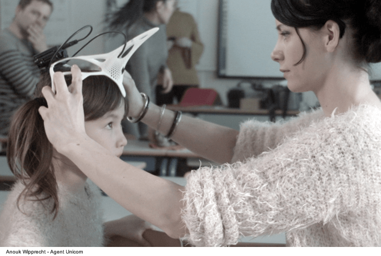 Agent Unicorn è un cerchietto in stampa 3D a forma di corno e dotato di fotocamera e sensore EEG (elettroencefalografia). È giocoso e confortevole allo stesso tempo, quindi i bambini lo indossano volentieri. Quando il sensore EEG riceve un segnale forte, la fotocamera si accende per registrare la visione del bambino nell’esperienza in tempo reale. In questo modo il dispositivo può fornire una comprensione migliore di ciò che eccita o distrae il bambino in diverse esperienze quotidiane.