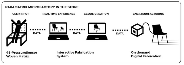 Paramatrix is a b2b service using unique customer data collected from a hand-woven textile sensor matrix to customize 3d models of design objects that can be manufactured locally and in the store with digital fabrications tools.